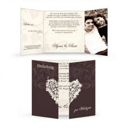 Elegante Einladung zur Hochzeit als Booklet in Dunkelbraun | Cariñokarten