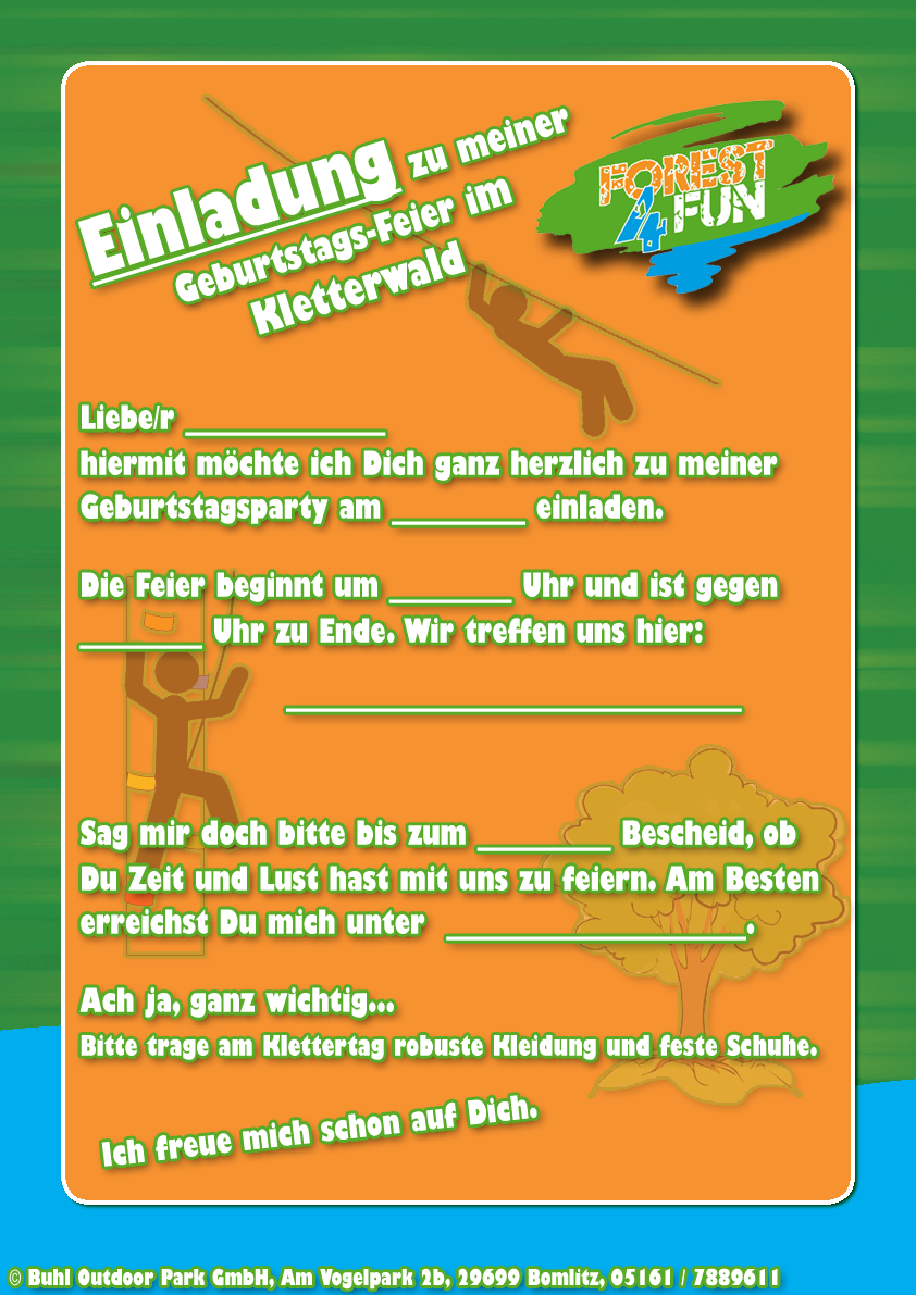Einladung Kindergeburtstag Hochseilgarten. Kindergeburtstage bei uns im Hochseilgarten sind immer ein ganz besonderes Erlebnis - die Kinder sind draußen aktiv und erleben echten Nervenkitzel in unserem mächtigen Buchenwald. Einladungskarten zum Geburtstag in vielen Motiven & Farben.